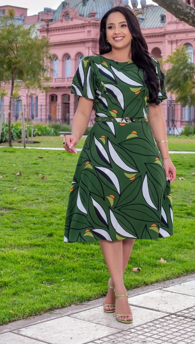 Com uma estampa de folhagem única, este vestido traz um toque de frescor e conexão com a natureza. A tonalidade verde botânico é perfeita para várias ocasiões, seja para um passeio casual ou um evento ao ar livre.