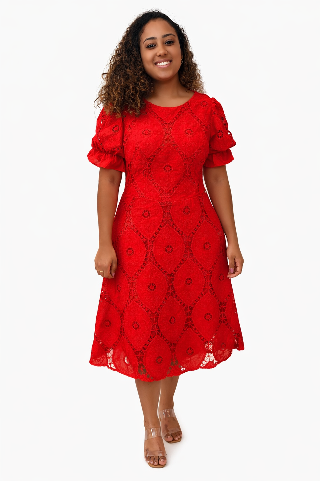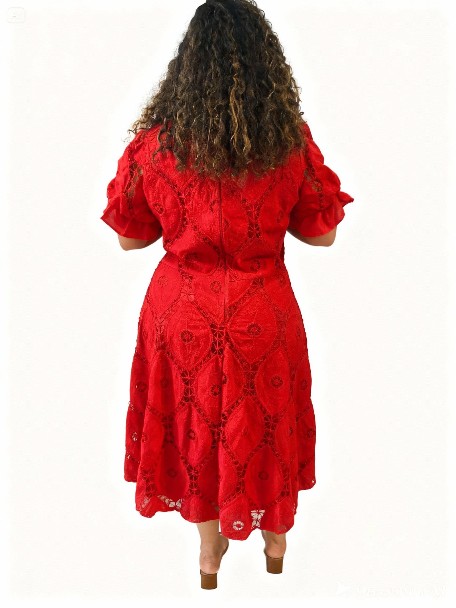 Este vestido apresenta um patch de guipure cuidadosamente trabalhado e inspirado em padrões geométricos que realçam ainda mais sua feminilidade. O corte godê cria um movimento encantador, adicionando charme e fluidez ao design. É uma peça que combina o clássico e o contemporâneo de forma magistral.